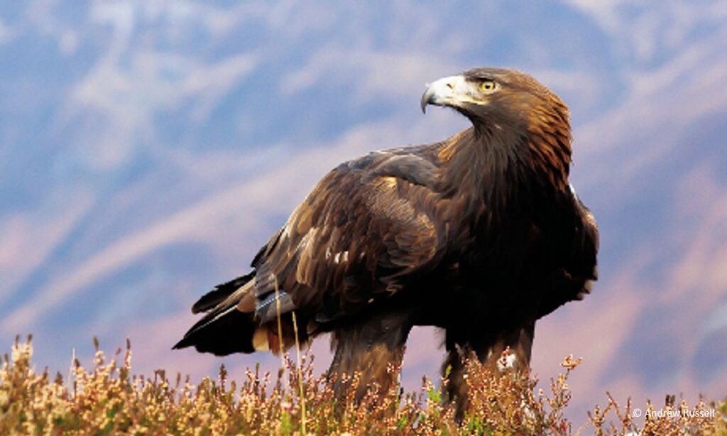 The majestic Golden Eagle is largely confined to remote parts of the Highland’s upland forests and its largest populations are in Mull, Skye, Glenmore, and Glen Affric.